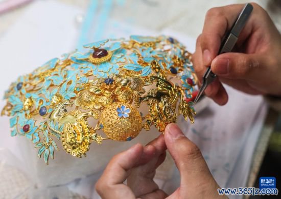 12月24日,在位于匡堰镇倡隆村的楝树下艺术墟落的花丝嵌入非遗工坊内,花丝嵌入身手传承东说念主高聪在用点翠工艺制作花丝嵌入工艺品。